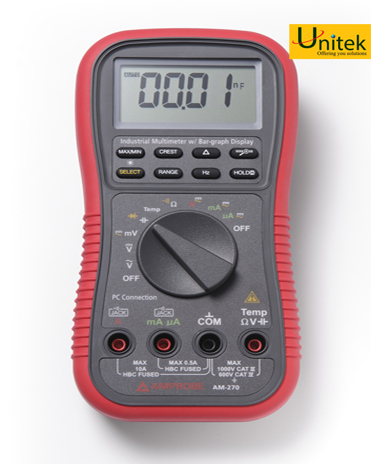 Đồng hồ vạn năng Amprobe AM-270 là một đồng hồ vạn năng true rms thương mại, cho các ứng dụng ngành điện và HVAC và dành cho các chuyên gia điện và HVAC. Đạt chuẩn an toàn CAT IV 600V và CAT III 1000V đối với các ứng dụng ngoài trời và trong nhà đòi hỏi phải kết nối trực tiếp tới bảng điện của tòa nhà hoặc đo đường dây ngoài trời để xây dựng các máy biến áp. Đồng hồ vạn năng true rms này đo các tham số điện bao gồm điện áp, dòng điện, điện trở và tần số. Và cũng bao gồm các ứng dụng HVAC với nhiệt độ, điện dung và các chức năng đo micro amps. Với chức năng True-rms cho độ chính xác cao.